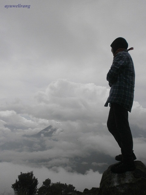 Di Watu Kotak, kami disuguhi dua tenda yang rubuh karena badai. Kami pun memasang perlengkapan masak di dekat tenda yang tak bertuan itu. Mungkin pemiliknya sedang summit. Aduh, kami jadi bergidik sendiri, karena kami tidak mungkin memaksa diri untuk sampai ke puncak. Setidaknya, sudah sampai Watu Kotak pun sudah sangat bersyukur. Dan benar saja, rintikan hujan mulai mengguyur kami dengan deras. Kami pindahkan peralatan masak ke cerukan batu di bawah kami, agar terlindung dari arah datangnya angin dan hujan. Kami memasak dan menghangatkan diri, sementara Bang Farhan menadah air untuk menutup persediaan air yang mulai tipis. Saya dan Kang Hilwan mulai berpikir lagi, apakah kami harus ke puncak atau tidak? Begitulah polemik Watu Kotak terjadi. Sekitar dua jam kami berlindung di Watu Kotak dari hujan, angin, dan petirnya. Dan sekitar pukul setengah satu, hujan mulai reda. Akhirnya, saya memutuskan untuk summit, dengan Kang Hilwan saja. Mbak Titi terkilir kakinya dan Bang Farhan memutuskan untuk menjaga Mbak Titi saja. Sudah fix, saya segera kenakan ponco bak tukang ojek dan mulai mendaki.