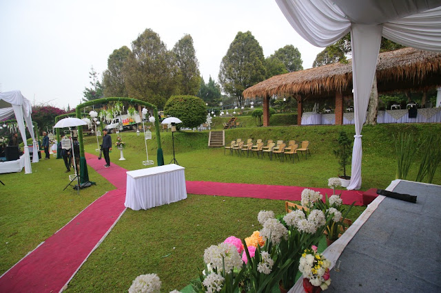 Jadi, untuk venue outdoor ini, saya pilih Villa Lazuardi Cisarua Bandung Barat. Lokasinya masih agak di bawah, belum ke Lembang banget, meskipun banyak orang menganggap itu Lembang. Padahal, Villa Lazuardi ini ada di Cisarua, masih jauh dari Lembang. Nah, alasannya pilih Lazuardi, karena harga sewanya itu untuk 24 jam, sudah plus keamanan dan kebersihan selama acara, termasuk listrik 3500 watt, dan kursi rotan lucu sebanyak 150 buah. Ini benefit tersendiri, karena dengan dapat kursi itu, saya jadi menghemat biaya pernikahan Bandung deh, nggak harus sewa kursi lagi untuk duduk tamu.