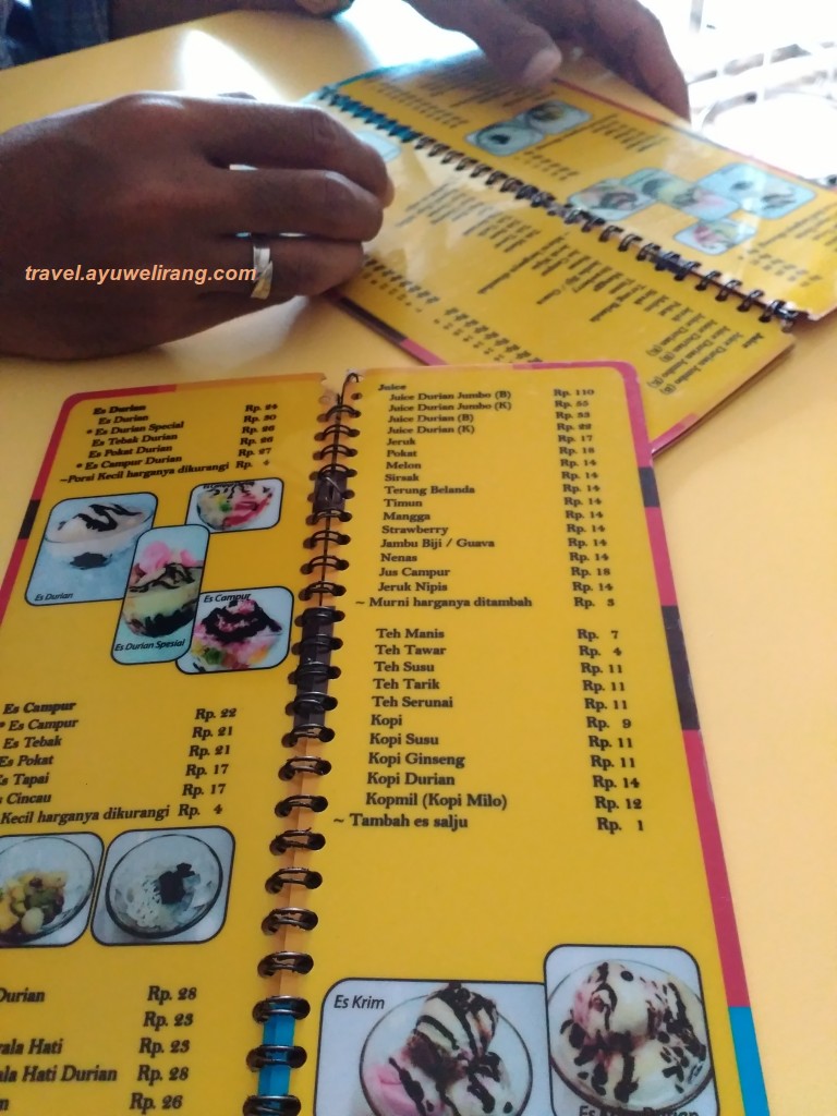 Kami pun menyantap ‘es durian nan sabananyo’ ini sembari menumpang update apps di telepon genggam. Haha! Selain untuk makan es durian, Iko Gantinyo juga enak buat tempat nongkrong dan ngobrol-ngobrol bersama teman. Ada wifi juga untuk mendukung pekerjaan kita. Buat yang tidak suka durian, bisa juga memesan menu minuman lain dan makanan.