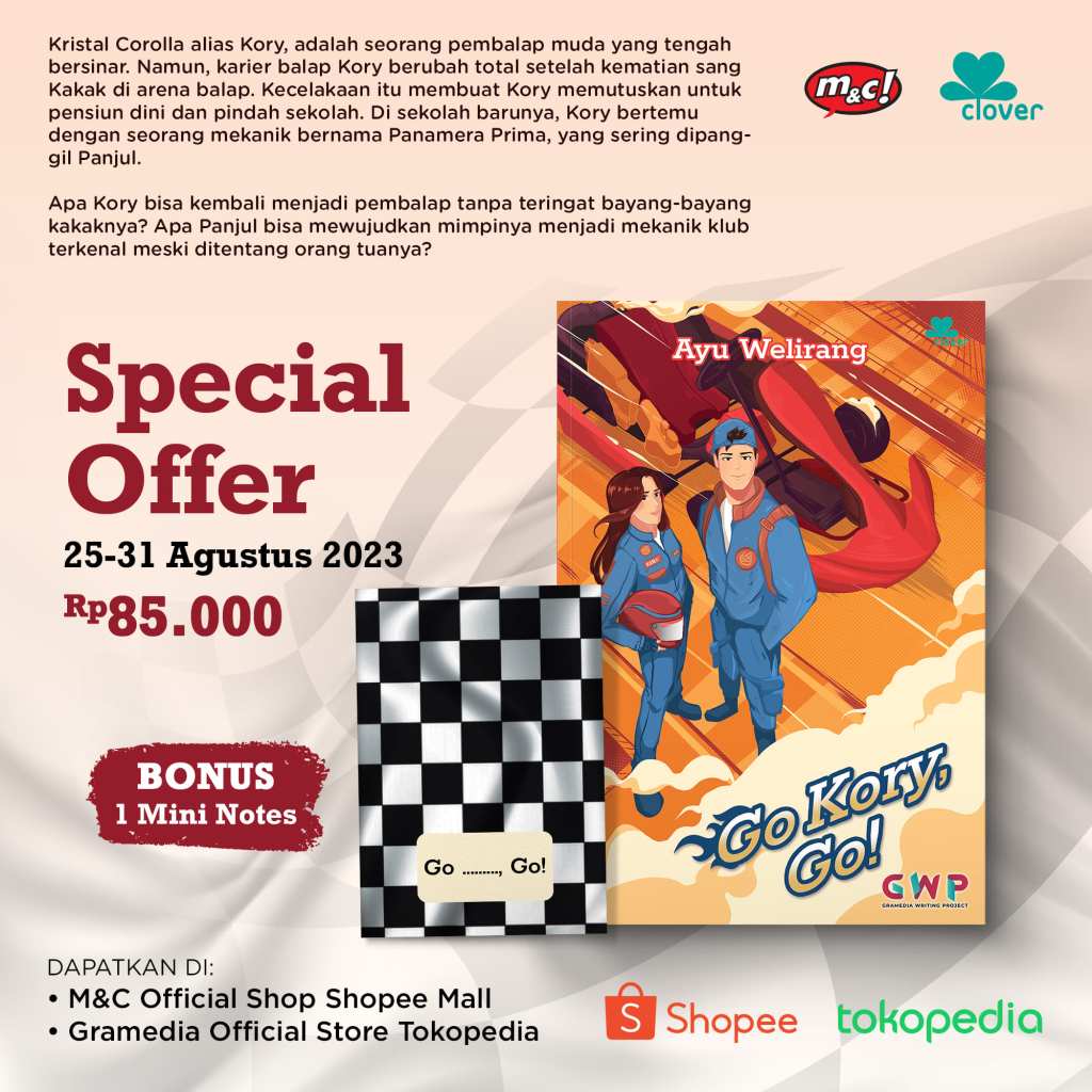 Sebelum curhat ini makin melantur, sebaiknya aku munculkan saja informasi yang seharusnya sudah muncul dari awal, yaitu promosi buku! Hahahaha. Go Kory, Go! masih buka special offer dan akan segera bisa kamu miliki setelah tanggal 31 Agustus 2023! Kamu bisa membelinya lewat situs-situs resmi penjualan buku Penerbit Clover atau melalui lokapasar gramedia.com (langsung klik aja, tautannya aktif, kok!).